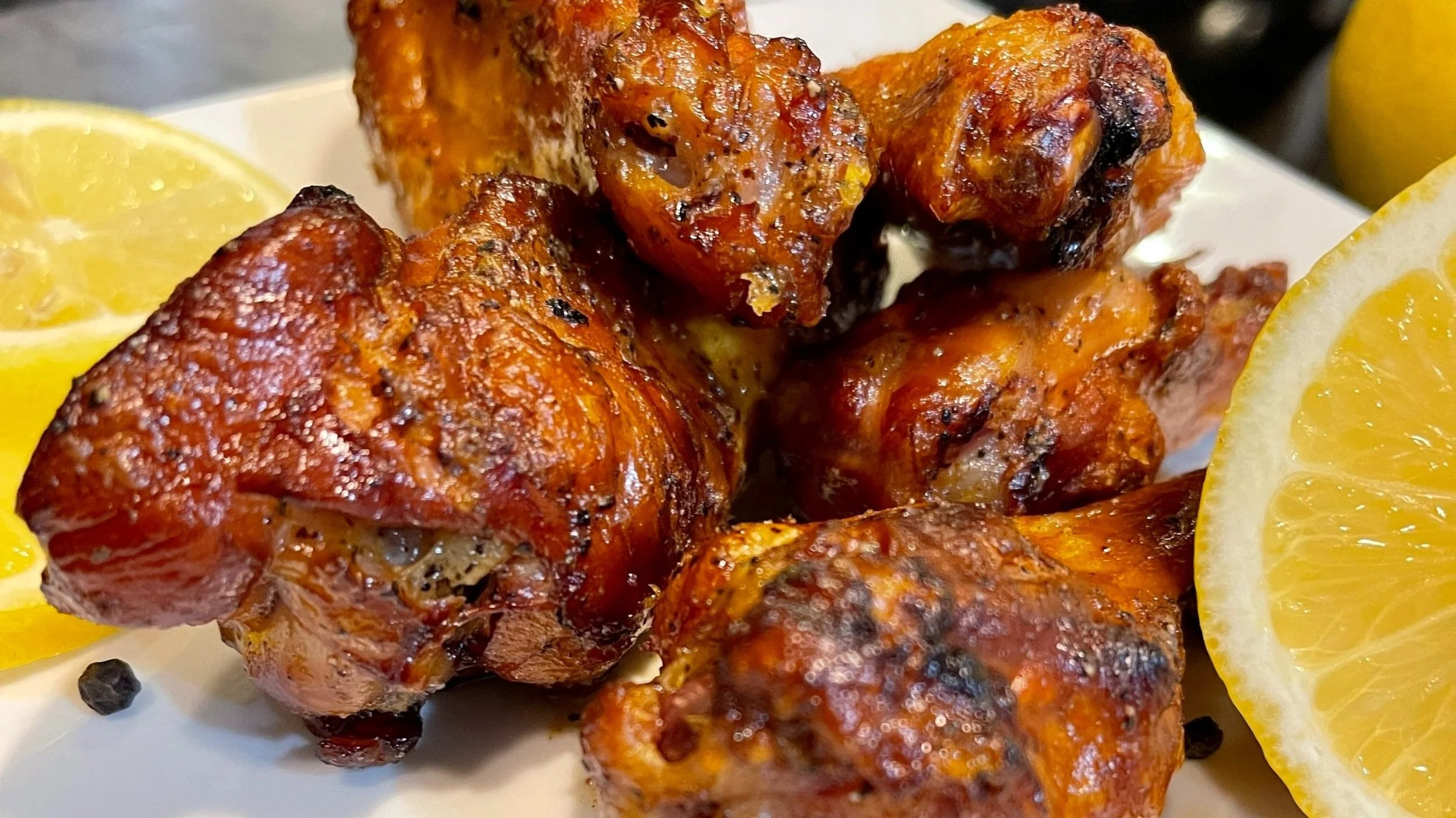 Juicy chicken wings grilled on a wood flame. Tossed in a lemon pepper browned butter sauce, and finished with a zesty herb lemon rub